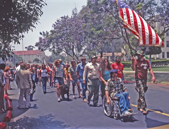 Ron Kovic and Gene Dorr (holding flag) leading Vietnam Veteran demonstration, LA, 1980.