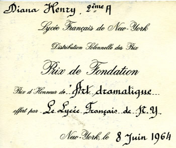 From DMH memoirs, [In 1959, having moved to NYC from Cincinnati] my parents enrolled me in the Lycée Français de New York, then located at 95th and Fifth, and it was a bumpy and harsh entry into the rigorous French educational system.... My Geography class was taught by the Lycée’s President, Maurice Galy, a pretentious and hyper-ambitious parvenu who bore down mercilessly on his students. My first assignment for him, a map of the ancient world, drawn and colored by hand, was torn up by him at the front of the class in a public act of humiliation which was by no means unique. I later saw him humiliate Paul Oppenheim, a brilliant German boy, telling him he “would never amount to anything, in this school.” I don’t know what went through Paul’s head at that moment - he promptly became a top student – but I know that at the moment of my humiliation, I determined that the only way I would survive in that environment would be to be tops in my class, a status I achieved the next year, in 7th grade, and never gave up until I entered Radcliffe, a year early. By the time Monsieur Galy overturned my desk in 7th grade, dumping its contents on the floor to demonstrate its deplorable untidiness, I was composed and took it all in stride, as the joke that it surely was for all except the dwindling little man who created the scene.... At the end-of the year prize ceremonies from that year on, I was called up to the stage again and again to accept first prizes in Latin, Greek, French, English, History, Geography – everything except Math, Physics and Chemistry – culminating in the coveted Prix d’Excellence which was awarded to the most highly achieving student in that grade overall. I was not forced to give up this honor until my last year, premiere, when Paul Oppenheim was awarded it while the three girls who contested it with him were all awarded Le Prix d’Honneur, second best overall. This was probably my first feminist “ah ha!” experience- Letty Pogrebin, take note, and thank you: you coined the phrase and popularized the insight that sooner or later we all share. [The above prize certificate for her performance as Marie La Bonne in La Cantatrice Chauve, by Ionesco. Her crowning moment when her tiny high heel caught between the floor boards of the makeshift stage and so, her monolgue complete, she stepped out of her shoes and sashayed off-stage. It was a perfect touch for the Dadaism of The Bald Soprano.]