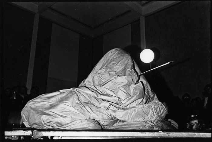 In recent correspondence, Joseph/Jody Burns, founder of the Museum of Holography and leading practitioner of Hologram Research, writes that "The cylindrical hologram in your photo of Charlotte performing the Kosugi bag piece at MoMA in 1977 is actually also Charlotte performing the same piece." He writes further about the perfomrance documented here: "I believe Takehisa Kosugi created that bag piece specifically for Charlotte. I was there also that evening at MoMA. Could that photographer lurking by the dais be Steve Borns? [Yes, that is he, photographing.]The cylindrical hologram in your top photo is a 360 degree hologram I made of Charlotte in 1975 performing that piece at my gallery space on west 20th St....https://whitney.org/Exhibitions/TakehisaKosugi and see also: