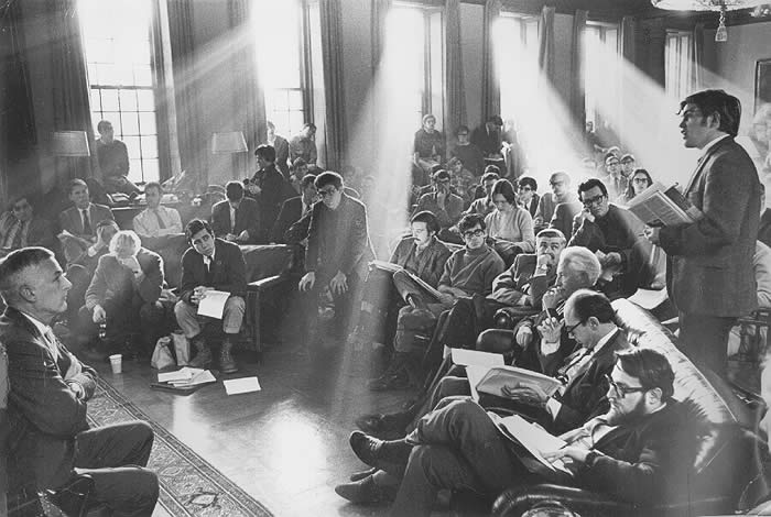 Showing her portfolio to Ernst Haas, circa 1976: Haas was so excited about the photo they are viewing, of the Harvard Student-Faculty meeting discussing divestment of South Africa, he ran down the hall to Cornell's office, shouting: "Cornell, Cornell, come see this photo!" HArvard's President Pusey at left, and front row, from right: Martin Peretz,Stanley Hoffmann, Erik Erikson.Lowell House Common Room, 1969.