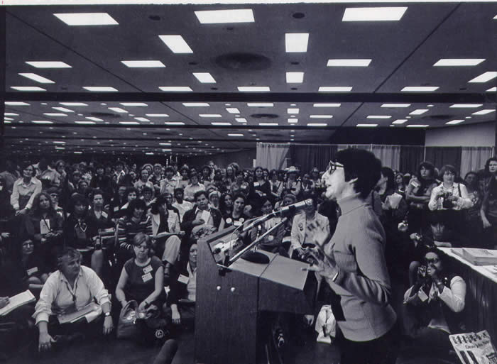 Midge Costanza speaking at forum, First National Women's Conference, Houston, 1977 by its official photographer.
