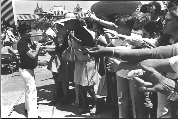 Midge Costanza handing out programs at the NY State Women's Meeting on the Empire State PLaza in Albany, one of 50 state conferences preliminarythe First National Women's Conference, Houston, 1977. After years as a Democratic Party volunteer, Costanza was elected to the Rochester City Council in 1973, the first woman elected to the council. The next year she tried, unsuccessfully, to unseat a Republican congressman. Bella Abzug mentored Midge and then Costanza replaced Bella Abzug in the White House, after Jimmy Carter fired Abzug 1/13/79.