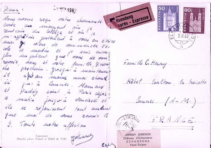 Johnny wrote to Diana, and she wrote back, during the year between the summer they met in Bürgenstock and the summer she spent at their Château d'Echandens. This must have been one of the first of that correspondence, when it seems the Simenon family was coming to check out the Henry family while they were still in Europe (and staying at another grand hotel) one last time before making the committment. Here Johnny writes: "Diana. We received your charming letter at the moment that I was coming back from middle school and as I was about to write you one. I just started school again this morning and I am even more impatient than you to see you again, you and your family, next Sunday. Up to now it has been at least as hot here as in Cannes. [His card is addressed to the C. Henry Family, Carlton Hotel, La Croisette, Cannes] Mommy and Daddy are in Paris from this morning until Friday and they are as delighted as I to see you again on S. All our affection, Johnny."