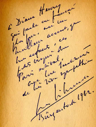 A note from Marie-Jo Simenon, middle child of Georges and Denyse Simenon. Marie-Jo later died tragically by her own hand. She wrote to DMH during the time that Diana had been brought into the Simenon family circle to be a friend to the children. The Henry family and the Simenon family had met in Bürgenstock, Switzerland, when Diana was 14. Georges Simenon said she spoke the most perfect French he had ever heard. (His exact words inscribed, below.) He invited her to join the family the next summer for a month at their castle as their cloistered children's guest. Diana Mara Henry is working on an illustrated autobiography of her life, with a working title of Golden Girl: My Walk through History, which will include more of these memories.