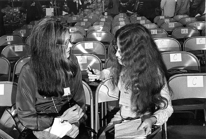 right: Gloria Steinem speaking at Women's caucus, Democratic National convention, 1976.