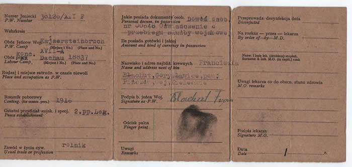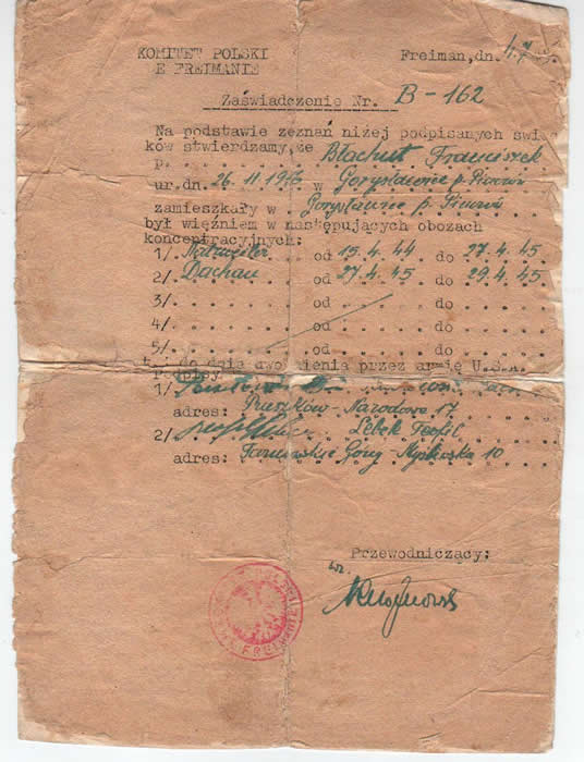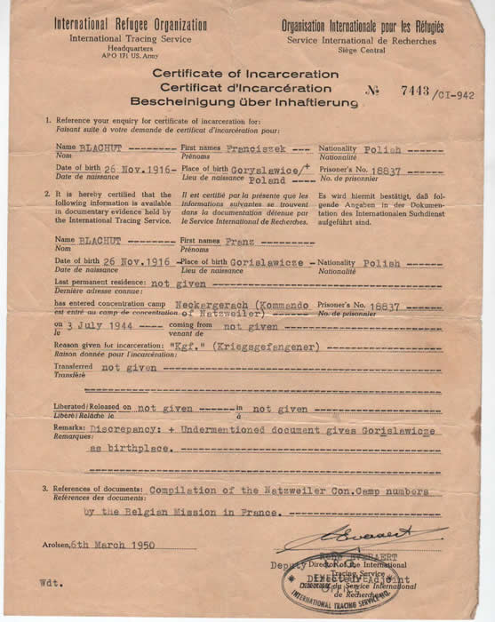 "My grandfather was [ ] at Natzweiler and later marched to Dachau. I thank god every day that he survived.[ ]His name was Franciszek Blachut (although in German it would have been Franz Blachhut) .... My father never even knew that his father was in Natzweiler until I told him. Whilst my grandfather had no qualms talking about Dachau and the gestapo in general- he never spoke of NAtzweiler where he spent years as opposed to days spent in Dachau. Thank you." C. Blachut, 12/8/2009
