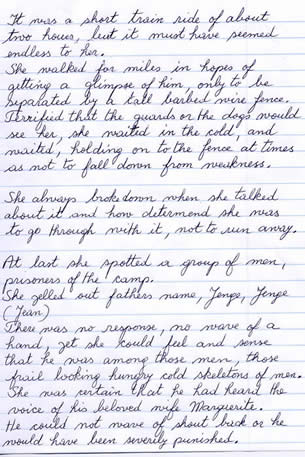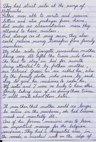 "I received an email from my sister Georgette today, and she has some input as to the biography and the dangerous feats my father and his resistance comrades did to upset the progress of the German armies.... I also have a very touching letter written to my mother from another prisoner when my father was in the camp of Hinzert. I believe that my father was unable to write at the time, maybe because of illness, and it read that my mother should destroy the letter after reading it, but she didn't. I will make copies and send it to you, it is rather interesting. I will get to busy and get my pen working to write our fathers story, and I have hopes that it will affect some people interested in works of the resistance. I will write again soon. Jeanne"