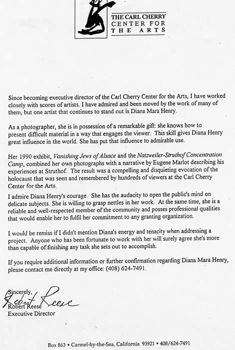 "I am pleased to have the opportunity to endorse, without reservation and with much enthusiasm, Ms. Diana Henry and her research project on the Nazi Concentration Camp, Natzweiler-Struthof...Her work when complete will be a particularly important addition to the literature of the Holocaust, raising questions uniquely suited to this particular camp. ...She is asking the right questions of her material, including some new and important ones...Considering the construction of a historical web site ( something that a great many of the camps already have, much to the benefit of scholarship...I see her photographic eye of enormous benefit....