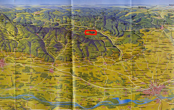 In this map, the Rhine River and Germany are at the very bottom, we are looking West. Strasbourg is the city at bottom right, Colmar is the city just visible at left.