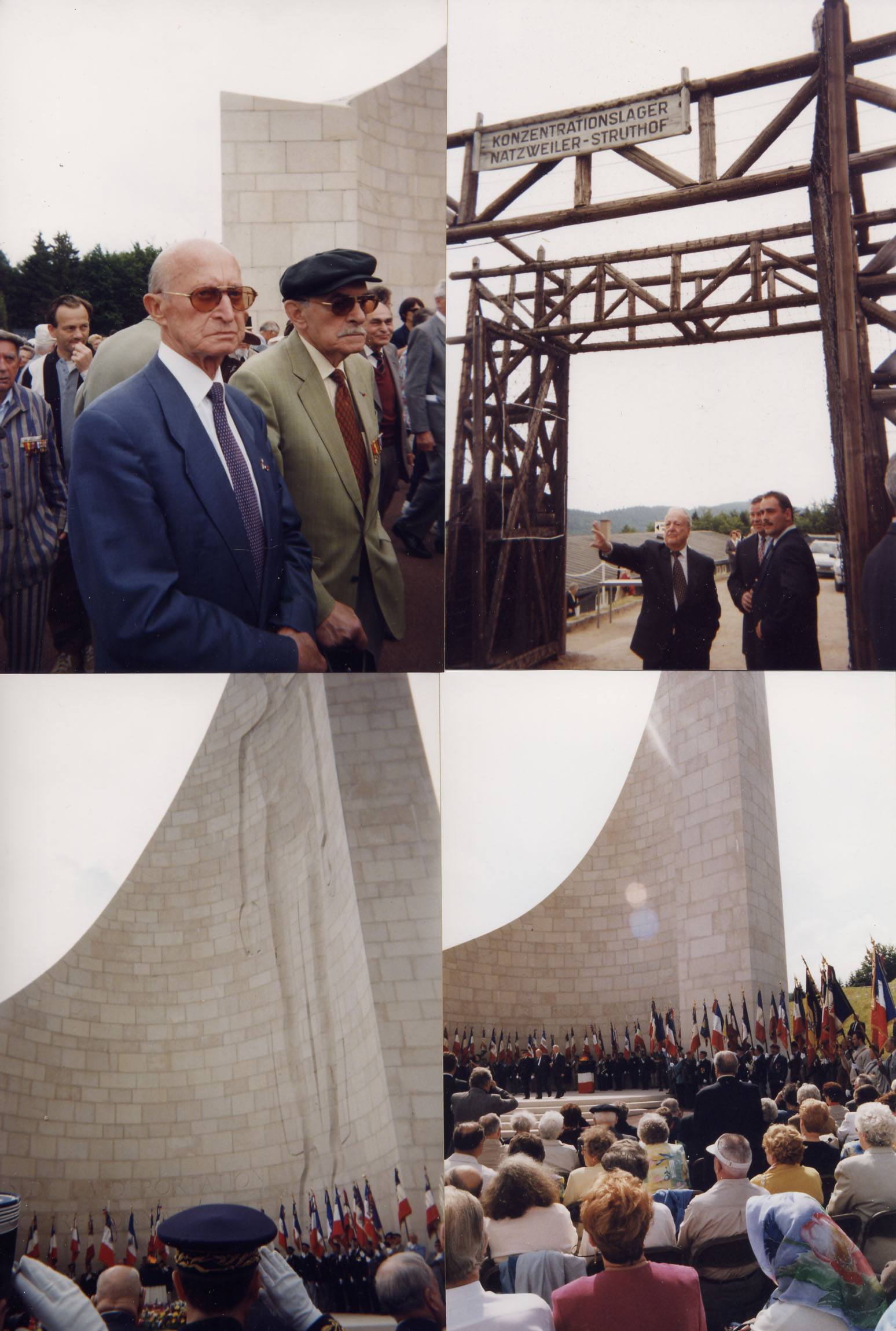 Dr. Lon Boutbien, survivor, at the foot of the monument; Gilbert May,left in small group, Jewish Maquisard from Alsace with fellow survivors of KLNa; survivors and their descendants sharing a pleasant moment before presenting the flags; procession begins its tour of the camp, starting at the top barracks. Photos and text copyright Diana Mara Henry.